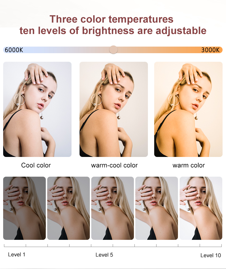 5、Three selectable color temperatures (3000K / 4500K / 6000K) and 10 brightness levels for precise control.