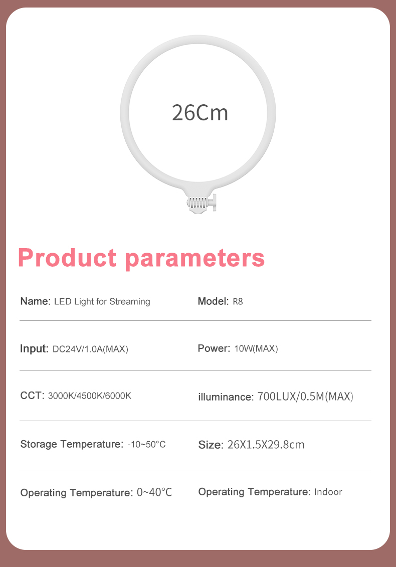 6、Maximum power consumption: 10W; provides up to 700 LUX illuminance at a distance of 0.5 meters.